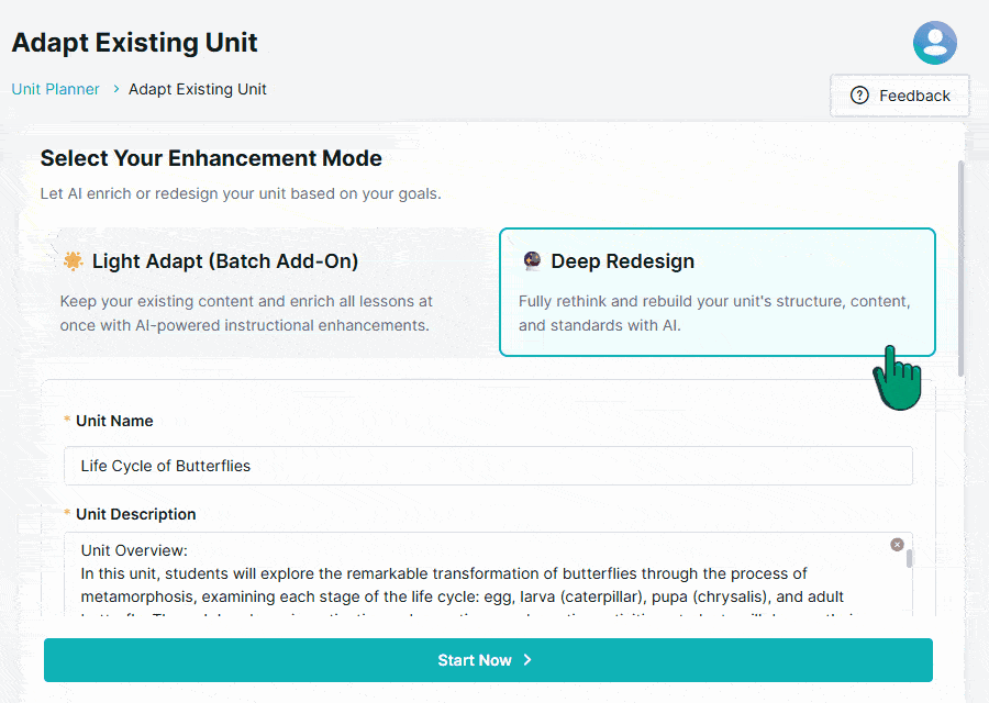 When tweaks aren’t enough, Deep Redesign steps in. Instead of throwing everything away, it treats your existing unit as raw material, keeping the best parts while redesigning the learning journey for where you want students to go now.