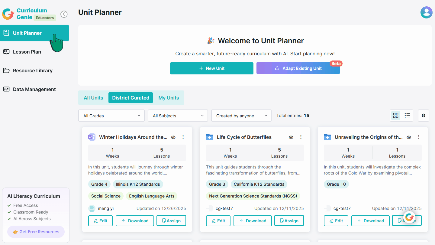 Curriculum Genie’s Unit Planner is a powerful, all-in-one solution that simplifies unit planning for educators. With AI support, you can create, organize, and monitor high-quality instructional materials (HQIM) in minutes—reducing planning time while strengthening standards alignment, student engagement, and instructional quality. This step-by-step tutorial walks you through the process from start to finish.